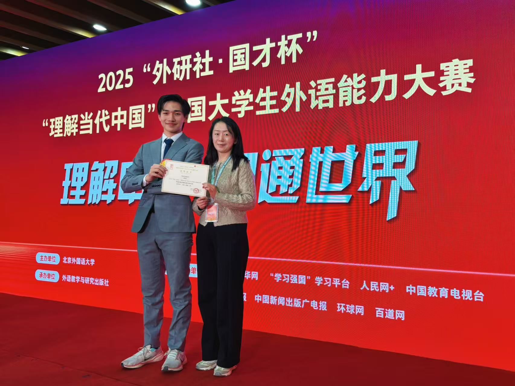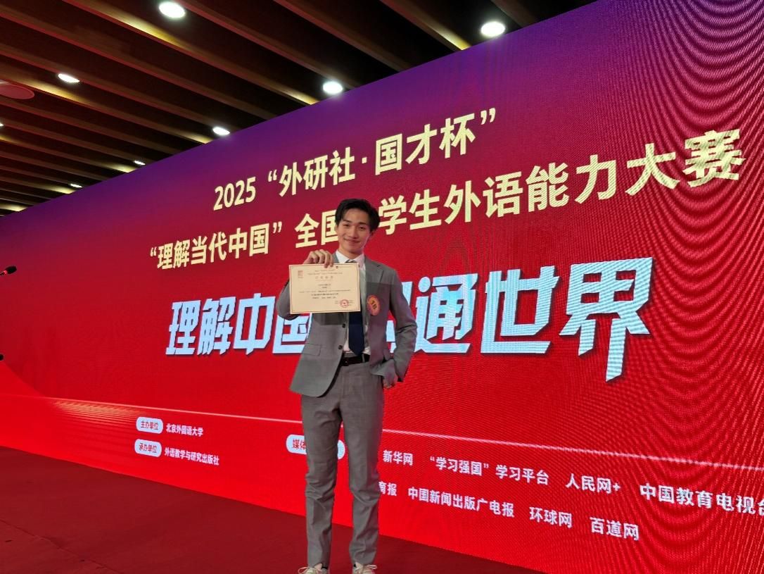 2023级本科生陈弘毅在语言智能学部教师指导下,获英语组国际传播综合能力赛项金奖,创造了学校在该赛事全国总决赛中的历史最好成绩。